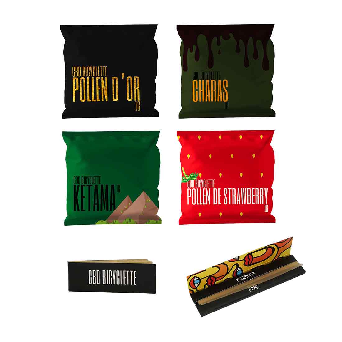 Dans ce pack premium vous trouverez : 1g de Charas CBD, 1g de Pollen d'or CBD, 1g de Kétama CBN, 1g de Pollen de Strawberry CBD, des filtres cartons et un paquet de feuilles à rouler.