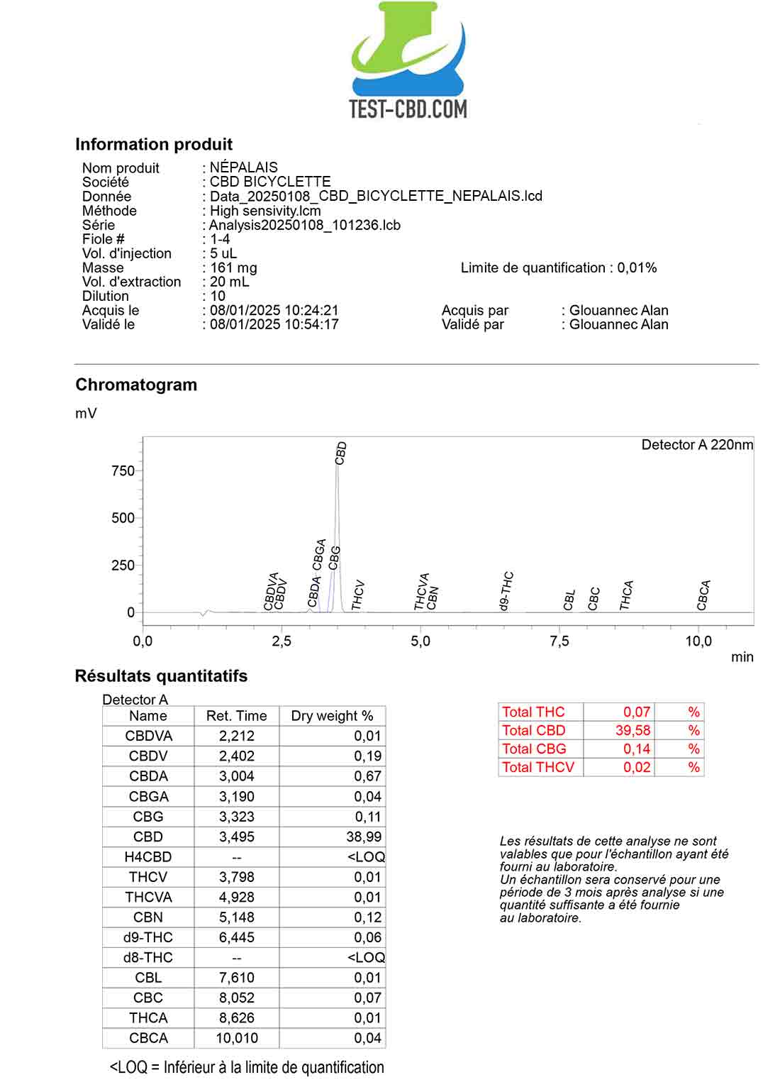 Comme vous pourrez le voir sur l'analyse, le lot en vente actuellement est à 0.07% de THC. Nous avons effectué des tests pour vérifier que ce taux n'entraine pas de résultats positifs aux tests salivaires. TOUS les test ont montrés des tests salivaires NEGATIFS !